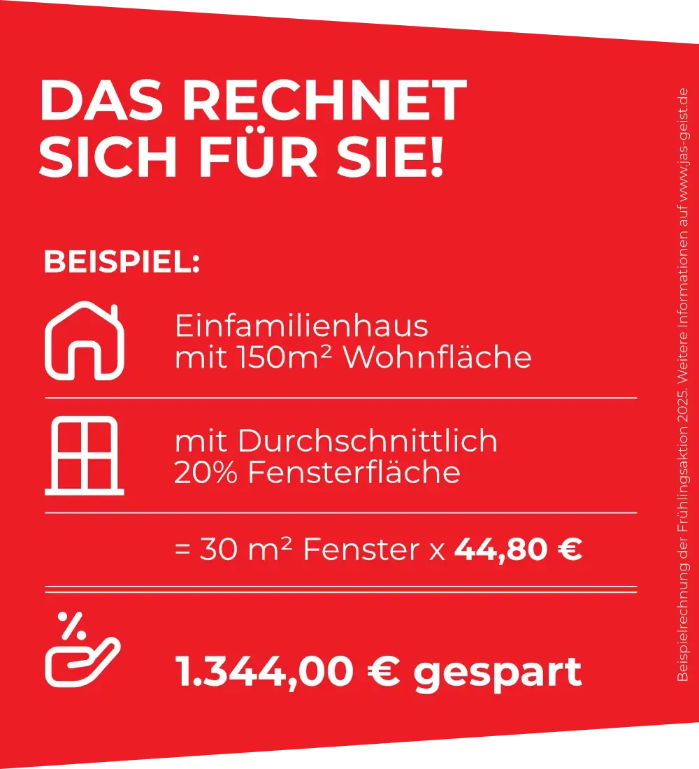 *Aktion für private Endverbraucher (Eigenheim/Eigentumswohnung): Preisersparnis von 44,80 € basierend auf der m²-Fläche der Fensterelemente mit 3-fach-Verglasung in allen angebotenen Fenstersystemen. Die Aktion gilt bis zum 31. Mai 2025 (Bestelleingang).