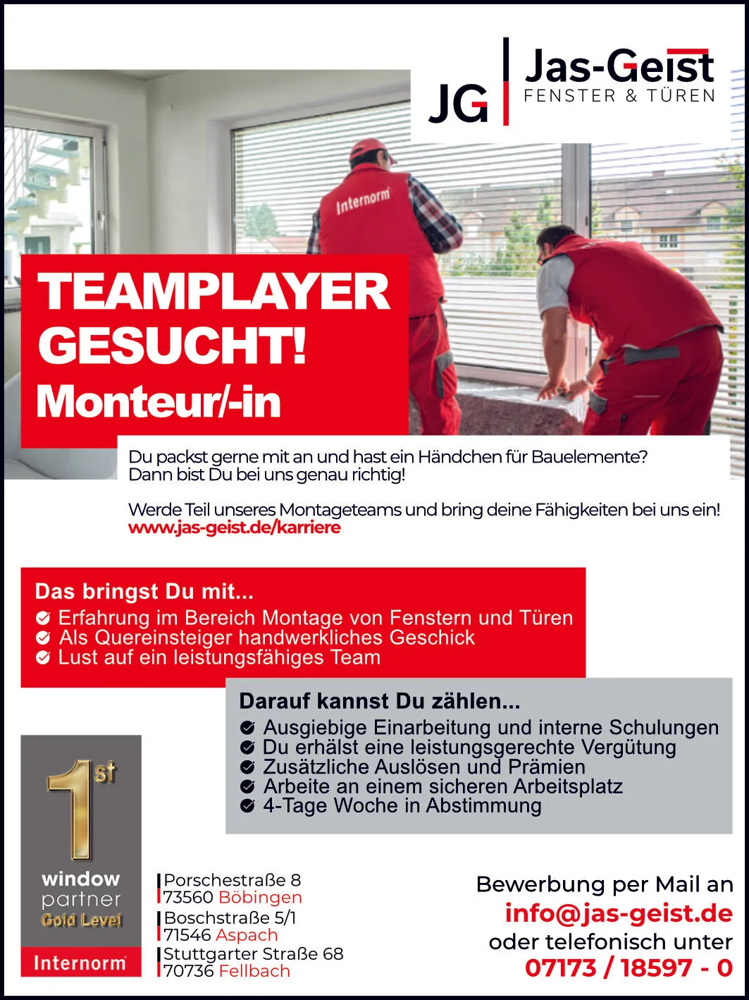 Die Firma Jas-Geist ist ein erfolgreiches und wachsendes Unternehmen im Bereich Bauelemente-Handel. An unseren Vertriebsstandorten mit Zentrale in Böbingen / Rems arbeiten ca. 30 Mitarbeiter/-innen ausschließlich im Bereich Vertrieb, Verwaltung und Montage.